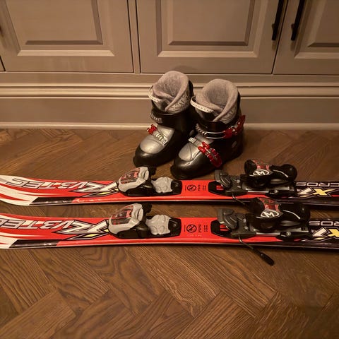 Både skidor och pjäxor är i gott skick.