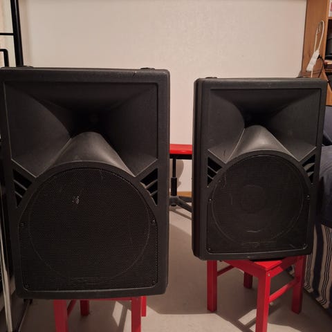 Stora hembyggda lådor med 2x Speakon (in/ut). Trycker ut mycket luft. bas gitarr låter gudomligt.