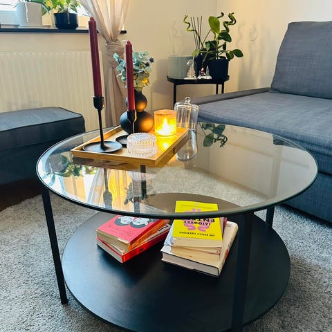 Stort stilrent soffbord från IKEA i modell som utgått. Skiva i frostat glas och ben i vit metall.
