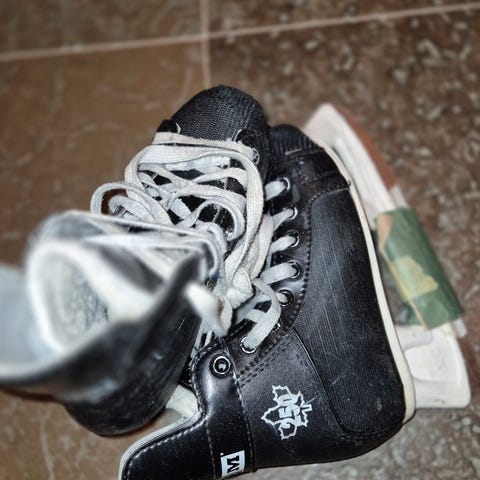 Säljer barnskridskor i storlek 35. De är av märket Rookie och är vita och rosa. Skridskorna har tre spännen för justerbar passform och är i använt skick.