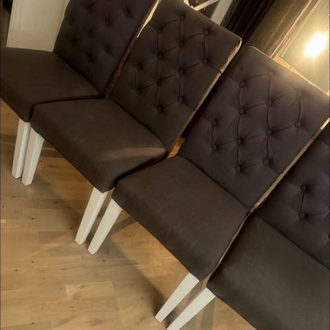 Fina och eftertraktade vintage-stolar. Fyra av stolarna är identiska. De återstående två är likadana, och väldigt lika de andra fyra. Lätt att byta tyg om man vill (men tyget är ganska nytt och fräsht).