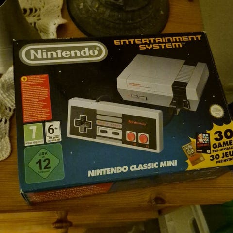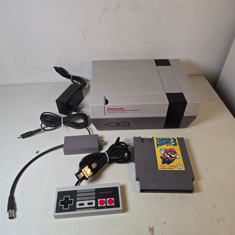 Nintendo Nintendo 8-bit Spelkonsol. Klassisk spelkonsol med två handkontroller och anslutningskablar. Används för att spela Nintendo 8-bitars spel.