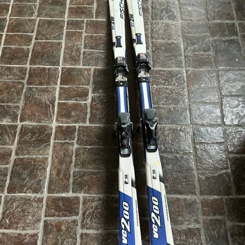 - Slalomskidor med bindning märke Fischer, längd 127 cm, pris 250 kr