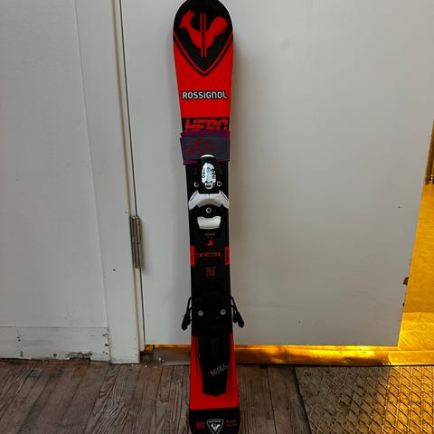 Rossignol X-10 barnskidor med tillhörande bindningar och pjäxor från Head. Storlek på pjäxorna 220-225 och motsvarar skostl 35.