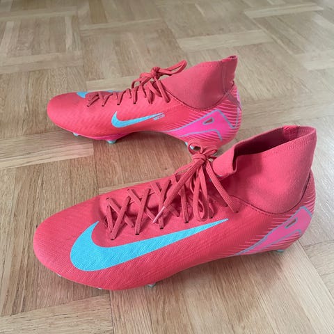 Ett par fotbollsskor från Nike. Skorna har en hög krage och snörning. Detaljer i blått.