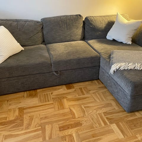 Öland bäddsoffa med höger divan. Förvaring i divanen. 2 nackkuddar. 3 - 5 sittplatser, 2 sovplatser. Längsbäddad. Bonellresår. L- Soffa. Tyg mellangrå.