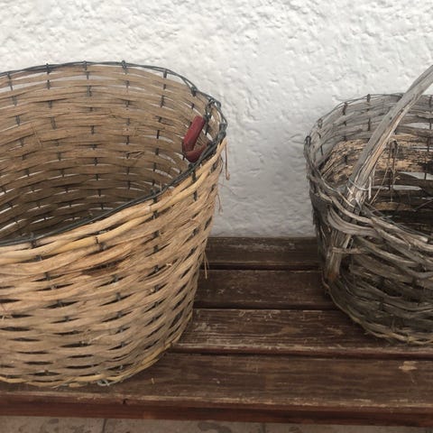 Svart flätad korg med två handtag, rund form och öppen design. Tillverkad av flätat material, lämplig för förvaring och organisering av olika hushållsartiklar.