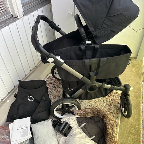 Bugaboo Donkey 5 singelvagn med tillhörande sidoväska i stormy blue.