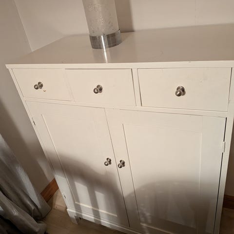 Tre stycken lösa skåp med luckor, en i trä och två med frostat. Använd som tv-bänk.