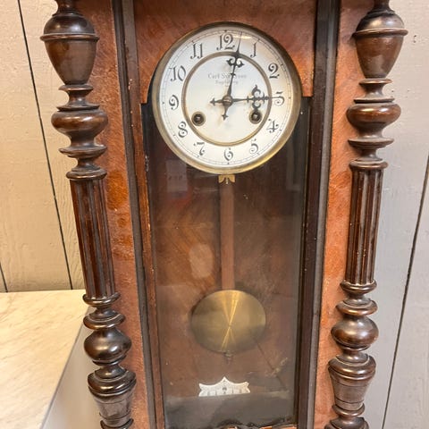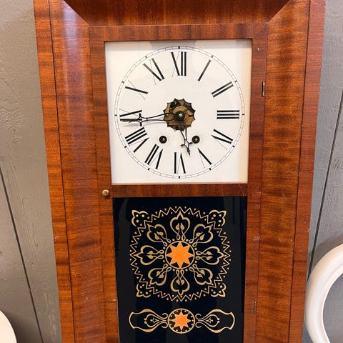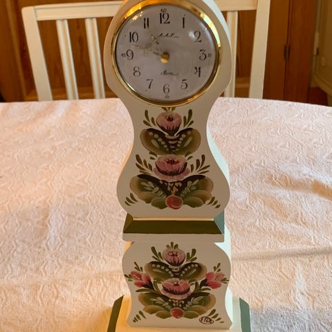 Klassisk Mora klocka tillverkad i trä med grön färg och dekorativa målade blommönster. Klockan har en traditionell design och är försedd med en rund urtavla med romerska siffror. Passar för inomhusbruk som väggdekoration eller tidmätare.