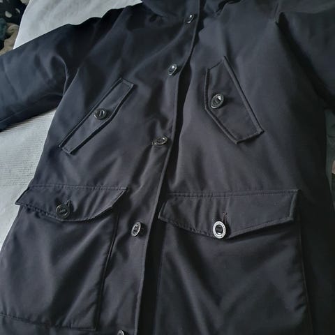 Jackan har 4 fickor fram, en dold innerficka, knappar och dubbel dragkedja som gör att jackan går att öppna ”underifrån”.