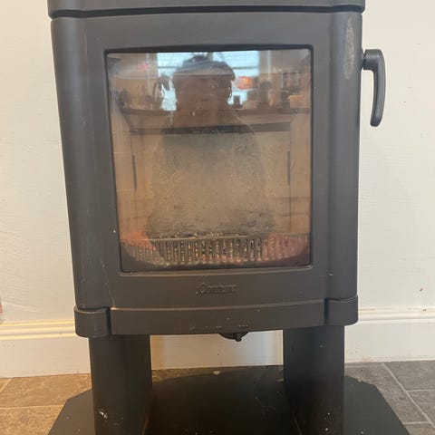 Ny täljstenskaminkamed glaslucka och en övre stenplatta. Kaminen är avsedd för uppvärmning och har en dörr med glas för insyn till eldstaden. Stenplattan på toppen kan användas för extra värmefördelning eller som värmehållare.