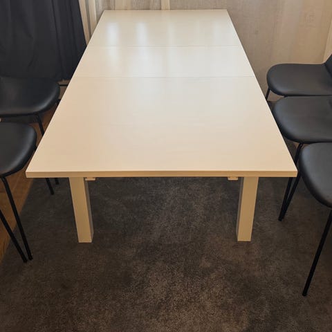 IKEA STENSUND matbord circa 2003. Klarlackat ekfaner med två iläggskivor som förvaras under bordet. L165/258xB100xH83 cm. Kan sitta 6-10 runt bordet.