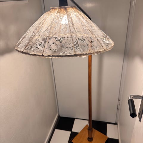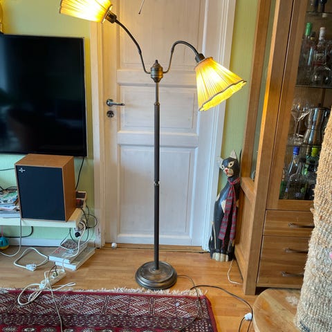 Mycket fin Retro lampa. Fot i mörkt trä. Stor skärm i gultonat sammet med fransar. Två lampor som kan tändas separat. Allt fungerar.