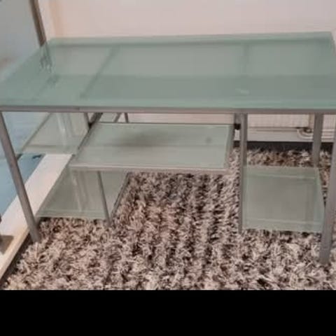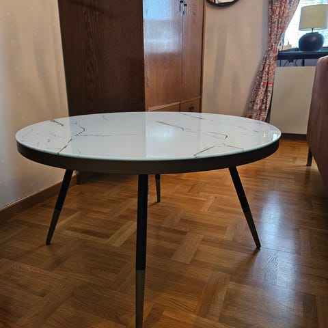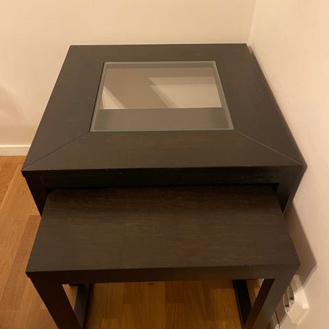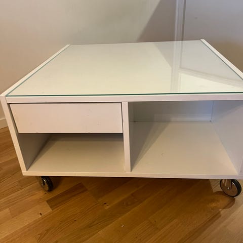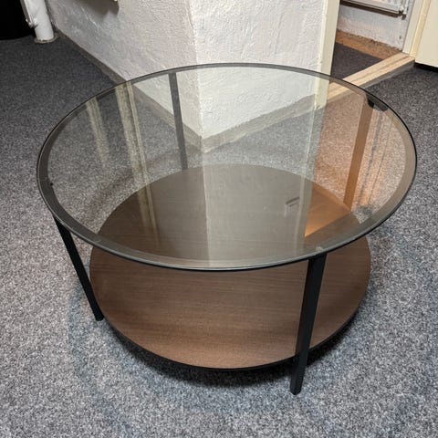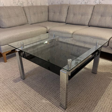 Glasbord med transparent glasskiva och svart underrede. Bordet har en modern design med metallben och en rektangulär form. Passar för vardagsrum.