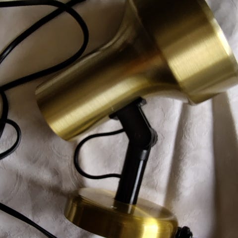 En vägglampa i mässing med justerbar arm. Lampan har en vit sladd med stickkontakt. Hellångt ca. 50cm