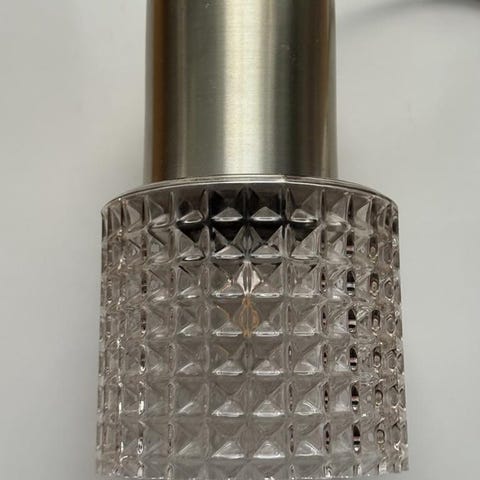 En retro taklampa med en unik design. Lampan har en glasbehållare omgiven av ett metallgaller. Kedjan och takkoppen är i en ljus färg. Perfekt för lantställen, sommarhus eller balkonger att skapa en vintage atmosfär i hemmet. Gammal normal stickkontakt, kan man byta till taklampa stickkontakten, se bilderna.