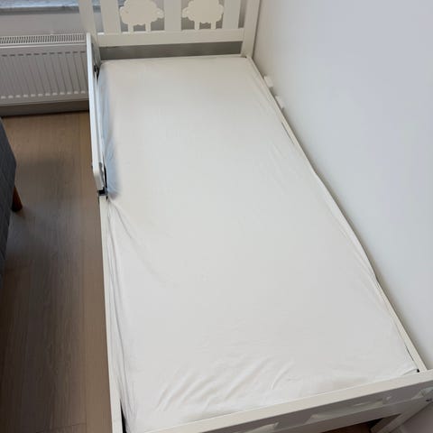 Lurnöy-säng, gul med madrass 85x130 plus två expanderande madrassdelar på 85x35 vardera. Hämtas på Södermalm