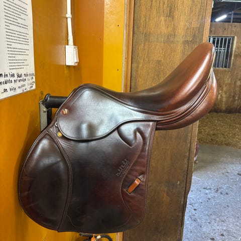Fin hoppsadel, stigläder och anatomisk sadelgjord ingår.