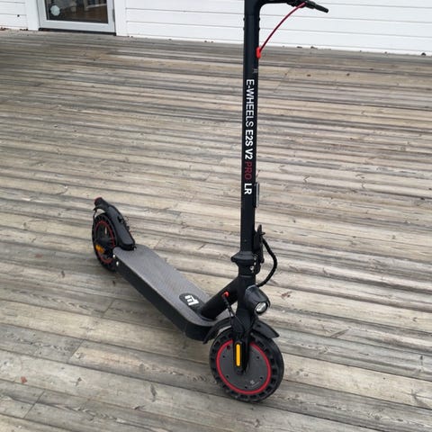 E-Wheels ES25 V2 Pro LR är en elscooter i svart färg. Den har en digital display för hastighet och batterinivå, handtag med grepp och bromssystem. Scootern är utrustad med robusta hjul och en stabil plattform för stående körning.