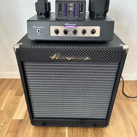 Har två stycken Ampeg PF-210HE med två 10-tums högtalare. Så 4*10. detta är den mycket populära modellen, portaflex. Tillhörande bastop.