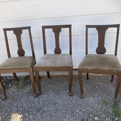 5 st karmstolar i samma utförande med hel ryggplatta, men de är inte renoverade ( tyg finns).