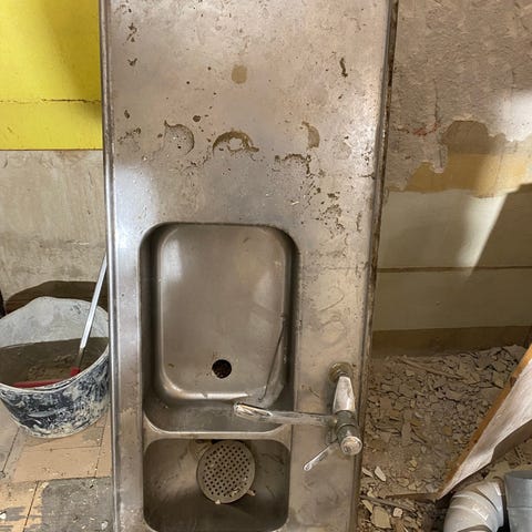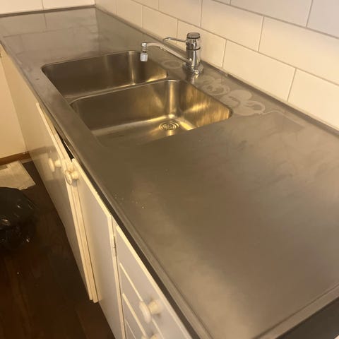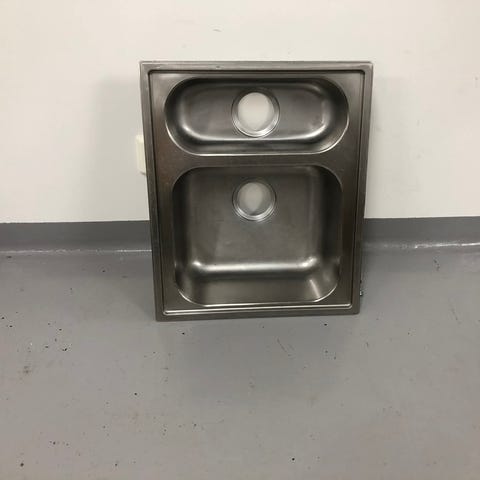 Rostfri diskbänk med två diskhon. Längd 212cm, djup 60