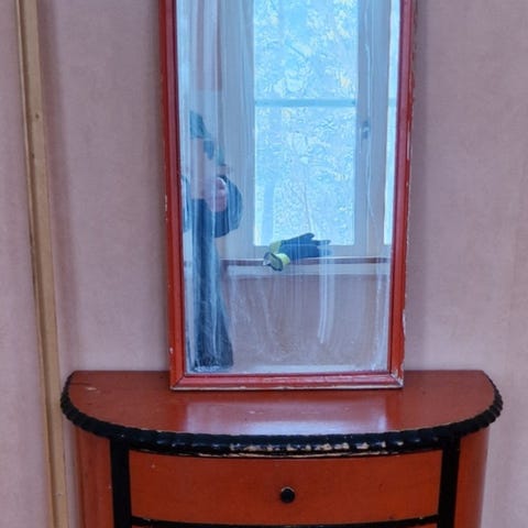Vi har en otroligt vacker äkta Henredon Spegel med stämpel som vi älskat att ha som del av vårt hem. Tyvärr i samband med flytt så får varken den eller vår fina hallmöbel (halv cirkel bord) plats.