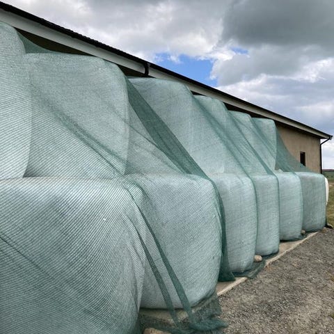 10 balar torrt plastat Hö från 2024 som är sent skördat, grövre och sockerfattigt , förekommer fläckar av mögel, håller inte riktigt måttet som foder till häst 100:-/bal
