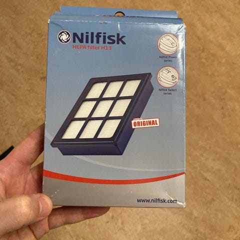 Silvrig dammsugare märke Nilfisk.