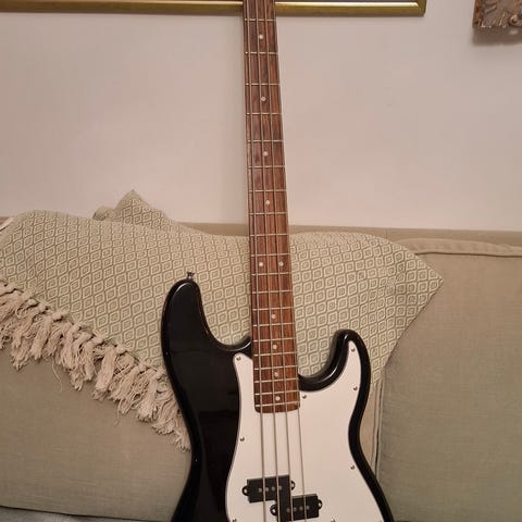 basgitarr i svart färg. Inkluderar en förstärkare och ett bärväska. Basgitarren är lämplig för musiker som söker ett kompakt och portabelt instrument.