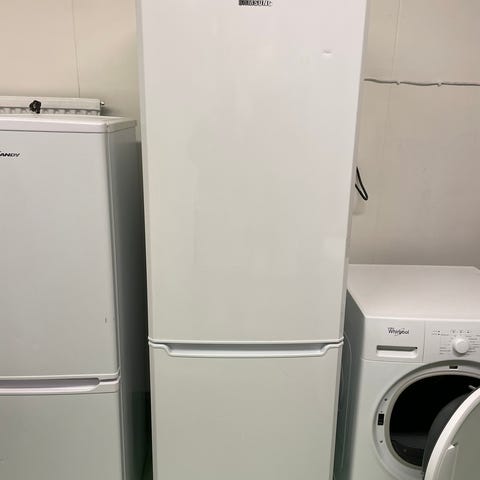 Cylinda Kombiskåp kyl och frys i vit färg. En kombinerad kyl och frys med separata dörrar för kyl och fryssektion. Utrustad med hyllor och förvaringsfack för effektiv organisering av matvaror.