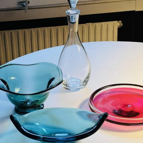 Säljer två stora fina fat gjort av återvunnet glas. Säljes tillsammans, aldrig använda.