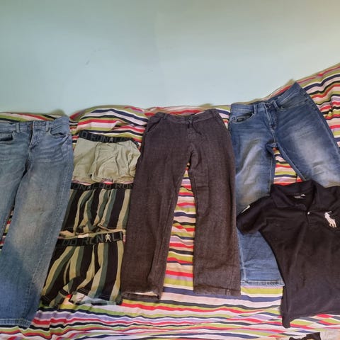 Ljusgrå vinter byxor, svart gympa byxor, ljusgrå puma byxor och jeans stl 122-128 pris 60 kr-80 kr/st