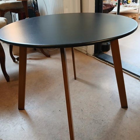 Soffbord i mörkt trä med underrede i metall. I bra skick, några enstaka skav på ovansidan men överlag i bra skick.