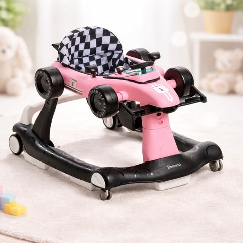 En gåstol från Beemoo med medföljande bromsklossar som går att justera. Batteridrivet aktivitetsbord som kan spela musik. Aktivitetsbordet går att ta av för att tillgängliggöra en bricka perfekt för mellis. Vagnen går att vika ihop.
