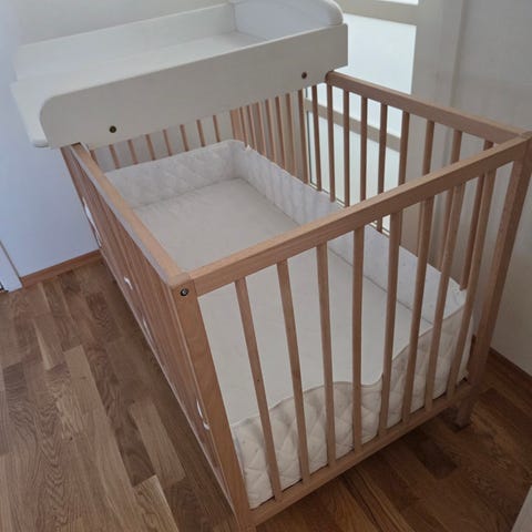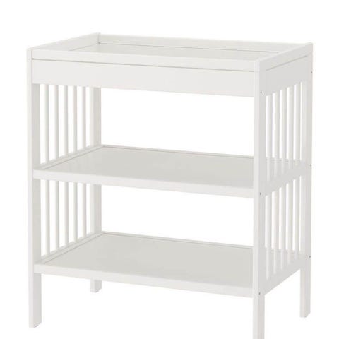 Beskrivning från Ikeas hemsida: IKEA barnmöbel skötbord i trä med två hyllplan. Skötbordet har en ljus träfinish och är utformat för att underlätta vid blöjbyten och annan barnvård. Möbeln har en stabil konstruktion med öppna hyllor för förvaring.