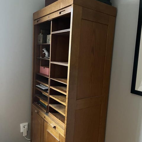 Inköpt på auktion och fungerat som förvaring av papper sedan dess. Skåpet är av det mer rejäla slaget med vackra snickeridetaljer, massiv ek. Lackad yta vilket gör det smidigt att torka av och hålla rent samt ger en vacker yta på ett sådant här typ av skåp.