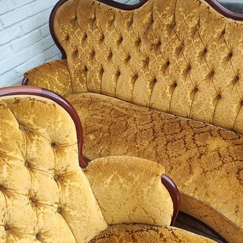 &Tradition Wilhelm Lauritzen soffgrupp bestående av soffa och fåtölj. Design av Wilhelm Lauritzen. Möbelgruppen har en klassisk design med rundade former och knappar i ryggstödet.