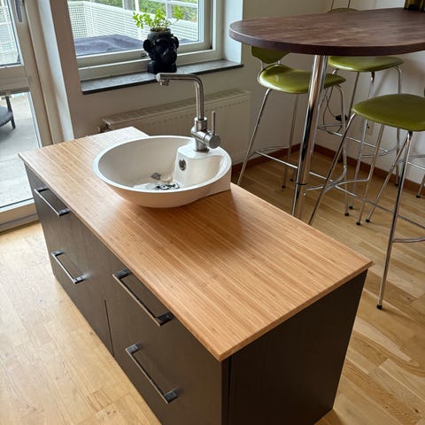 Köksö på hjul med plats för tre-fyra barstolar på två sidor. Hjulen går att låsa. Bänkskivan går att skruva bort om så önskas. Märke på bänkskivan, se bild. Annars gott skick.