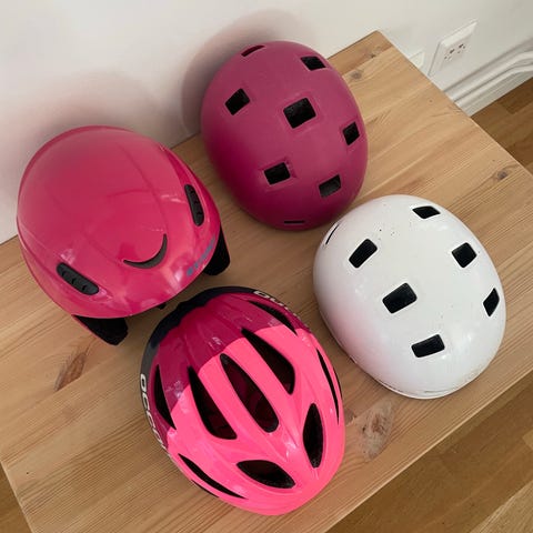 Tre olika hjälmar för slalom, pulka och cykling.