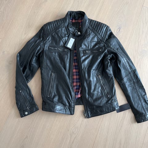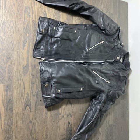 Vanson Leathers motorcykeljacka i svart och gul läder med flera märkespatchar. Jackan har detaljer som USA-flagga och texttryck på ärmar och rygg. Designad för motorcykelanvändning med robust material.