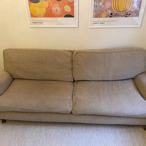 Klassisk 3-sits Howard-soffa med rundade armstöd och hjul på benen. Bekväm sittkomfort.