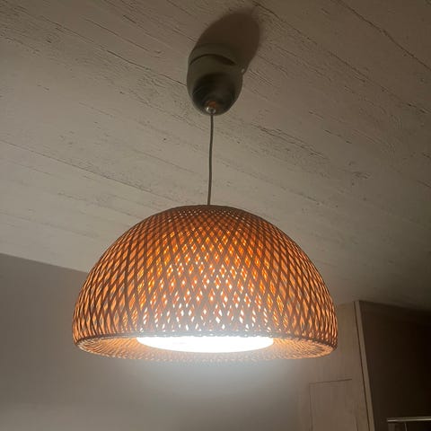 Säljer en dekorativ taklampa i bambu, knappt använd och i mycket gott skick. Lampan har varit nedpackad och är endast uppsatt nu för fotografering, vilket gör att den kan upplevas som något dammig.