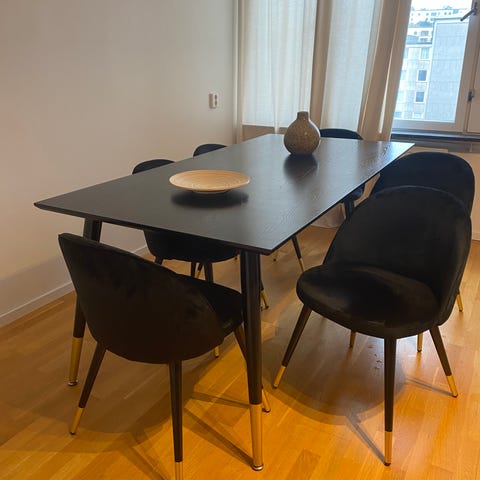 Säljer matbord med 8 stolar.