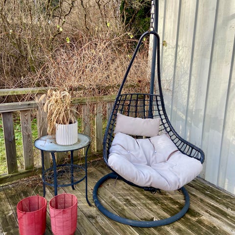 Hängstol med stativ och beige dyna
