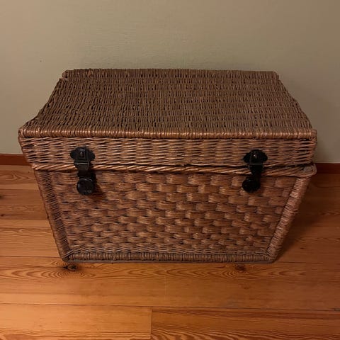 Handflätad korg med lock tillverkad i trä. Korgen har ett rutmönster och ett handtag på locket för enkel öppning.