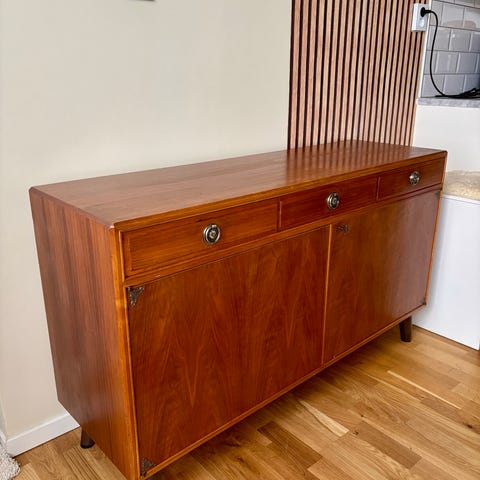 Retro vintage sideboard , skulle tro 50-tal. Ok helhet men toppskivan är lite ojämn, försökt fota detta. Nyckel finns.
