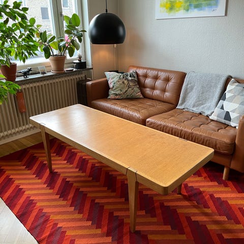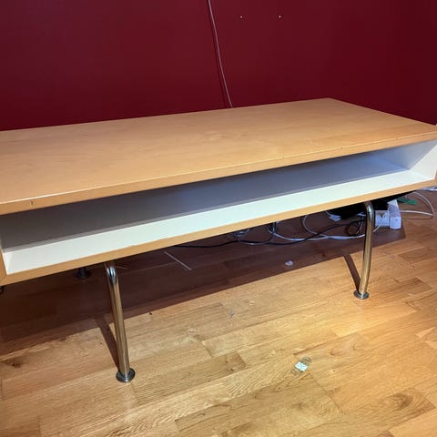 Soffbord ur IKEA PS-serien i björkfanér med kromade ben och praktisk hylla, design Thomas Eriksson 1999.