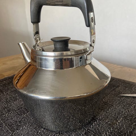 Alessi vattenkanna tillverkad i rostfritt stål med ett blått handtag. Vattenkannan har en konisk form och en pip med en röd detalj. Passar för uppvärmning av vatten och användning i köket.